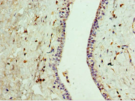 Immunohistochemistry of paraffin-embedded human testis tissue using CSB-PA818781DSR1HU at dilution of 1:100