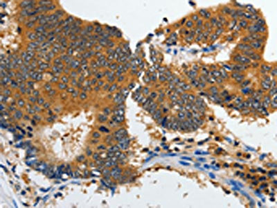 The image on the left is immunohistochemistry of paraffin-embedded Human colon cancer tissue using CSB-PA788203(GRIA2 Antibody) at dilution 1/70, on the right is treated with synthetic peptide. (Original magnification: ×200)