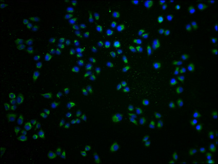 Immunofluorescence staining of Hela cells with CSB-PA009929LA01HU at 1:100, counter-stained with DAPI. The cells were fixed in 4% formaldehyde and blocked in 10% normal Goat Serum. The cells were then incubated with the antibody overnight at 4°C. The secondary antibody was Alexa Fluor 488-congugated AffiniPure Goat Anti-Rabbit IgG(H+L).