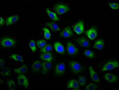 Immunofluorescence staining of A549 cells with CSB-PA740924LA01HU at 1:66, counter-stained with DAPI. The cells were fixed in 4% formaldehyde, permeabilized using 0.2% Triton X-100 and blocked in 10% normal Goat Serum. The cells were then incubated with the antibody overnight at 4°C. The secondary antibody was Alexa Fluor 488-congugated AffiniPure Goat Anti-Rabbit IgG(H+L).