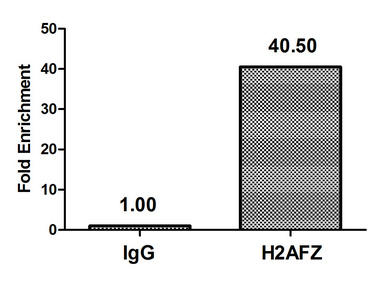 • Chromatin Immunoprecipitation Hela (4*106) were treated with Micrococcal Nuclease, sonicated, and immunoprecipitated with 5µg anti-H2AFZ (CSB-PA010100OA04nme1HU) or a control normal rabbit IgG. The resulting ChIP DNA was quantified using real-time PCR with primers against the β-Globin promoter.