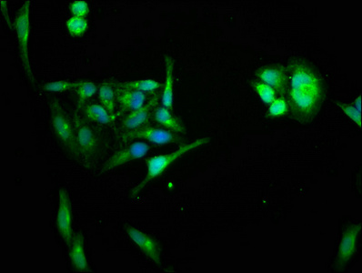 Immunofluorescence staining of Hela cells with CSB-PA803159LA01HU at 1:66, counter-stained with DAPI. The cells were fixed in 4% formaldehyde, permeabilized using 0.2% Triton X-100 and blocked in 10% normal Goat Serum. The cells were then incubated with the antibody overnight at 4°C. The secondary antibody was Alexa Fluor 488-congugated AffiniPure Goat Anti-Rabbit IgG(H+L).