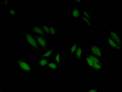 Immunofluorescent analysis of Hela cells using CSB-PA010418OA18nacHU at dilution of 1:100 and Alexa Fluor 488-congugated AffiniPure Goat Anti-Rabbit IgG(H+L)