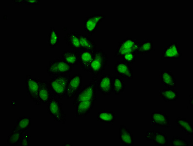 Immunofluorescence staining of Hela cells with CSB-PA010418OA18nforHU at 1:15, counter-stained with DAPI. The cells were fixed in 4% formaldehyde, permeabilized using 0.2% Triton X-100 and blocked in 10% normal Goat Serum. The cells were then incubated with the antibody overnight at 4°C. The secondary antibody was Alexa Fluor 488-congugated AffiniPure Goat Anti-Rabbit IgG(H+L).