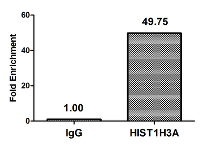 Chromatin Immunoprecipitation Hela (4*106) were treated with Benzanase, sonicated, and immunoprecipitated with 5µg anti-HIST1H3A (CSB-PA010418OA23nbhbHU) or a control normal rabbit IgG. The resulting ChIP DNA was quantified using real-time PCR with primers against the β-Globin promoter.