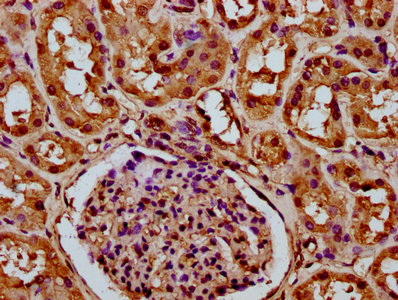 IHC image of CSB-PA010418OA79nme1HU diluted at 1:20 and staining in paraffin-embedded human kidney tissue performed on a Leica BondTM system. After dewaxing and hydration, antigen retrieval was mediated by high pressure in a citrate buffer (pH 6.0). Section was blocked with 10% normal goat serum 30min at RT. Then primary antibody (1% BSA) was incubated at 4°C overnight. The primary is detected by a biotinylated secondary antibody and visualized using an HRP conjugated SP system.