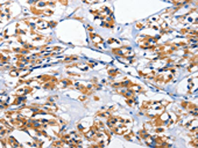 The image on the left is immunohistochemistry of paraffin-embedded Human thyroid cancer tissue using CSB-PA611310(HK2 Antibody) at dilution 1/40, on the right is treated with fusion protein. (Original magnification: ×200)