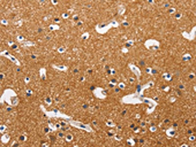 The image on the left is immunohistochemistry of paraffin-embedded Human brain tissue using CSB-PA611310(HK2 Antibody) at dilution 1/40, on the right is treated with fusion protein. (Original magnification: ×200)