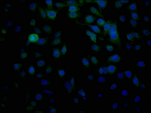 • Immunofluorescence staining of HepG2 cells with CSB-PA361187LA01HU at 1:100, counter-stained with DAPI. The cells were fixed in 4% formaldehyde and blocked in 10% normal Goat Serum. The cells were then incubated with the antibody overnight at 4°C. The secondary antibody was Alexa Fluor 488-congugated AffiniPure Goat Anti-Rabbit IgG(H+L).