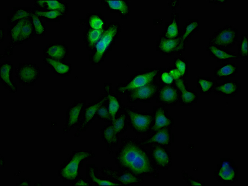 • Immunofluorescence staining of HepG2 cells with CSB-PA361187LA11HU at 1:100, counter-stained with DAPI. The cells were fixed in 4% formaldehyde and blocked in 10% normal Goat Serum. The cells were then incubated with the antibody overnight at 4°C. The secondary antibody was Alexa Fluor 488-congugated AffiniPure Goat Anti-Rabbit IgG(H+L).