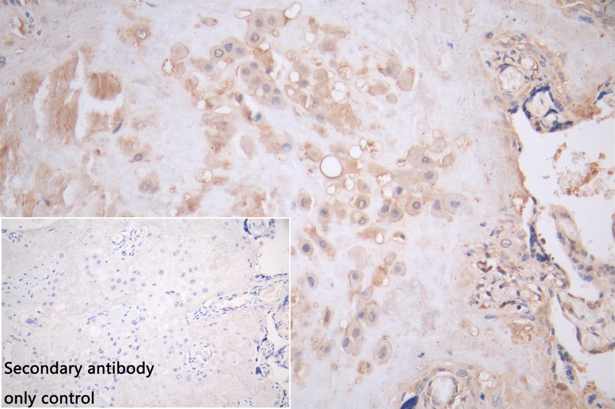 IHC image of CSB-PA15099A0Rb diluted at 1:400 and staining in paraffin-embedded human placenta tissue performed on a Leica BondTM system. After dewaxing and hydration, antigen retrieval was mediated by high pressure in a citrate buffer (pH 6.0). Section was blocked with 10% normal goat serum 30min at RT. Then primary antibody (1% BSA) was incubated at 4°C overnight. The primary is detected by a Goat anti-rabbit polymer IgG labeled by HRP and visualized using 0.05% DAB. Secondary antibody only control: uses 1% BSA instead of primary antibody