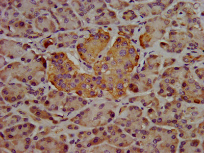 IHC image of CSB-PA010704LA01HU diluted at 1:400 and staining in paraffin-embedded human pancreatic tissue performed on a Leica BondTM system. After dewaxing and hydration, antigen retrieval was mediated by high pressure in a citrate buffer (pH 6.0). Section was blocked with 10% normal goat serum 30min at RT. Then primary antibody (1% BSA) was incubated at 4°C overnight. The primary is detected by a biotinylated secondary antibody and visualized using an HRP conjugated SP system.