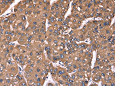 The image on the left is immunohistochemistry of paraffin-embedded Human liver cancer tissue using CSB-PA589788(HRG Antibody) at dilution 1/50, on the right is treated with synthetic peptide. (Original magnification: ×200)