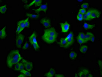 Immunofluorescence staining of MCF-7 cells with CSB-PA887972LA01HU at 1:133, counter-stained with DAPI. The cells were fixed in 4% formaldehyde, permeabilized using 0.2% Triton X-100 and blocked in 10% normal Goat Serum. The cells were then incubated with the antibody overnight at 4°C. The secondary antibody was Alexa Fluor 488-congugated AffiniPure Goat Anti-Rabbit IgG(H+L).