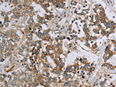 • The image on the left is immunohistochemistry of paraffin-embedded Human colon cancer tissue using CSB-PA077030(HSD17B14 Antibody) at dilution 1/30, on the right is treated with fusion protein. (Original magnification: ×200)
