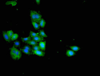 • Immunofluorescent analysis of HepG2 cells using CSB-PA861999LA01HU at dilution of 1:100 and Alexa Fluor 488-congugated AffiniPure Goat Anti-Rabbit IgG(H+L)