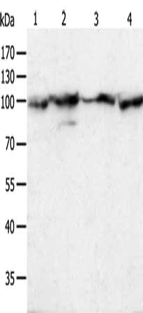 Gel: 10%SDS-PAGE, Lysate: 40 μg, Lane 1-4: Hela cells, human liver cancer tissue, Jurkat cells, NIH/3T3 cells, Primary antibody: CSB-PA179036(HSP90B1 Antibody) at dilution 1/500, Secondary antibody: Goat anti rabbit IgG at 1/8000 dilution, Exposure time: 3 seconds