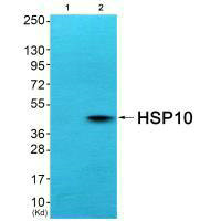 Western blot analysis of extracts from COS7 cells (Lane 2), using HSP10 antiobdy. The lane on the left is treated with systhesized peptide.