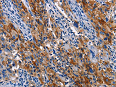• The image on the left is immunohistochemistry of paraffin-embedded Human lung cancer tissue using CSB-PA793095(ICAM1 Antibody) at dilution 1/40, on the right is treated with synthetic peptide. (Original magnification: ×200)