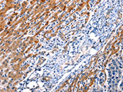 The image on the left is immunohistochemistry of paraffin-embedded Human liver cancer tissue using CSB-PA794163(ID4 Antibody) at dilution 1/20, on the right is treated with synthetic peptide. (Original magnification: ×200)