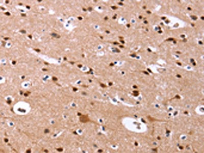 The image on the left is immunohistochemistry of paraffin-embedded Human brain tissue using CSB-PA935129(ID4 Antibody) at dilution 1/40, on the right is treated with synthetic peptide. (Original magnification: ×200)