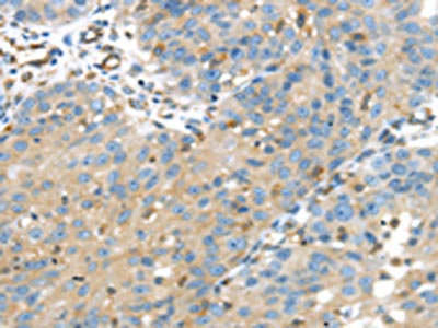 The image on the left is immunohistochemistry of paraffin-embedded Human liver cancer tissue using CSB-PA250918(IGFBP4 Antibody) at dilution 1/35, on the right is treated with fusion protein. (Original magnification: ×200)