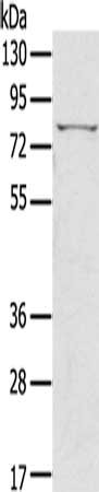 • Gel: 6%SDS-PAGE, Lysate: 50 μg, Lane: Raji cells, Primary antibody: CSB-PA987228(IKBKE Antibody) at dilution 1/400, Secondary antibody: Goat anti rabbit IgG at 1/8000 dilution, Exposure time: 30 seconds