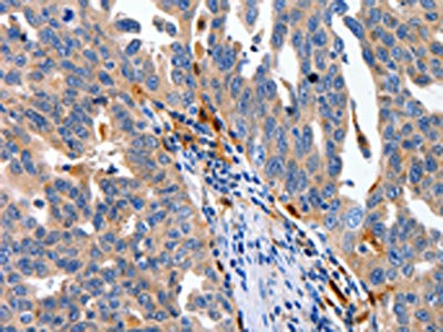 The image on the left is immunohistochemistry of paraffin-embedded Human cervical cancer tissue using CSB-PA634259(IL18 Antibody) at dilution 1/100, on the right is treated with fusion protein. (Original magnification: ×200)