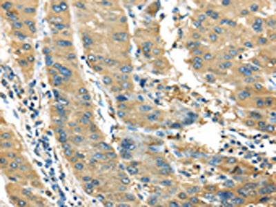 The image on the left is immunohistochemistry of paraffin-embedded Human liver cancer tissue using CSB-PA911335(IL3RA Antibody) at dilution 1/35, on the right is treated with synthetic peptide. (Original magnification: ×200)