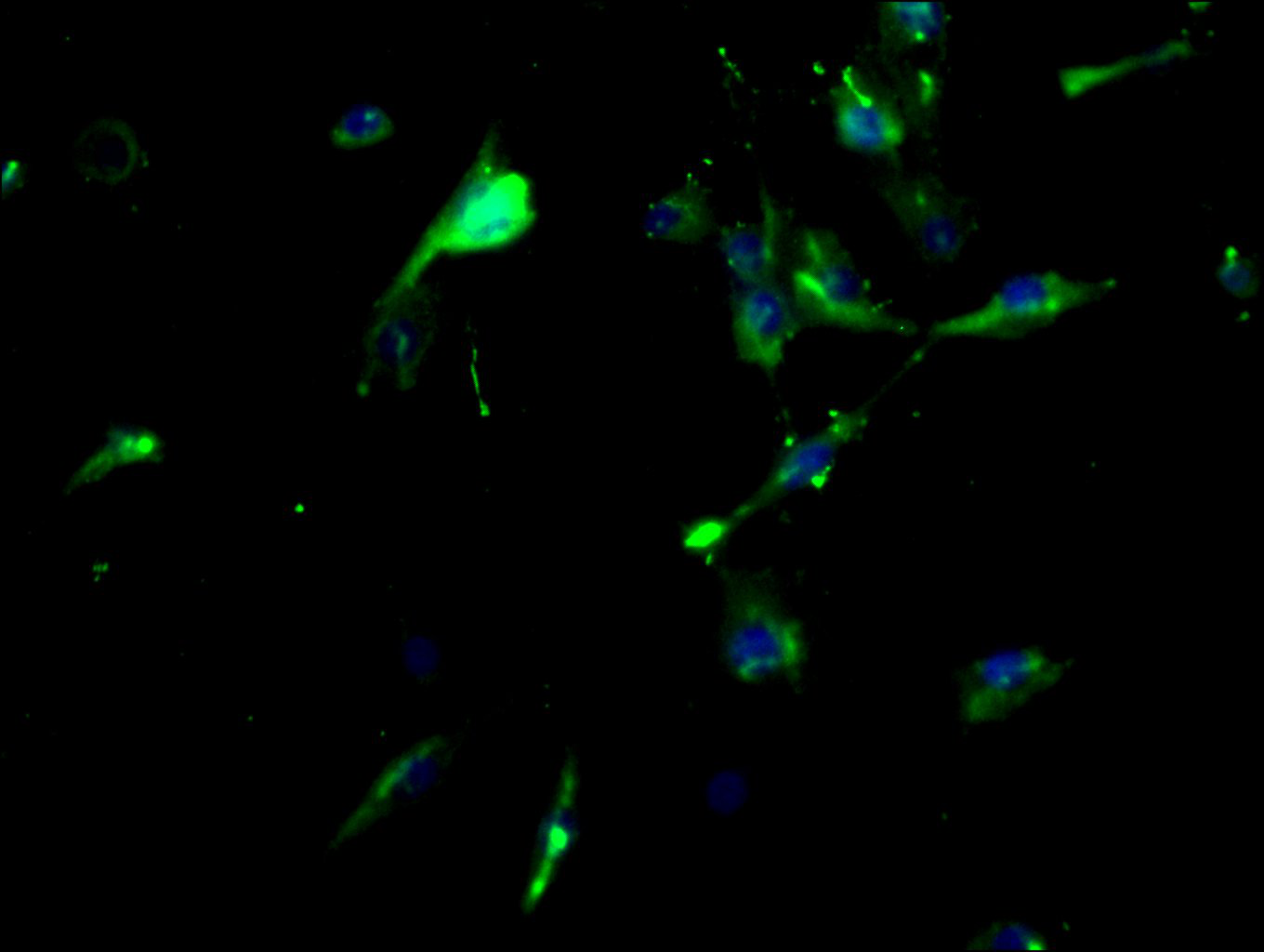 • Immunofluorescence staining of U87 cells with CSB-PA011670EA01HU at 1:200, counter-stained with DAPI. The cells were fixed in 4% formaldehyde, permeabilized using 0.2% Triton X-100 and blocked in 10% normal Goat Serum. The cells were then incubated with the antibody overnight at 4°C. The secondary antibody was Alexa Fluor 488-congugated AffiniPure Goat Anti-Rabbit IgG(H+L).