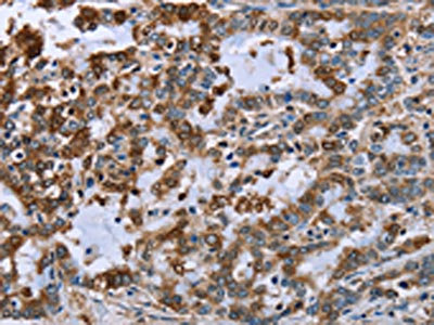 The image on the left is immunohistochemistry of paraffin-embedded Human liver cancer tissue using CSB-PA914299(IMPDH2 Antibody) at dilution 1/60, on the right is treated with fusion protein. (Original magnification: ×200)