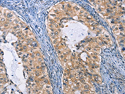 The image on the left is immunohistochemistry of paraffin-embedded Human liver cancer tissue using CSB-PA283183(IRF3 Antibody) at dilution 1/30, on the right is treated with fusion protein. (Original magnification: ×200)