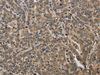 The image on the left is immunohistochemistry of paraffin-embedded Human liver cancer tissue using CSB-PA252563(KCNMB2 Antibody) at dilution 1/40, on the right is treated with synthetic peptide. (Original magnification: ×200)
