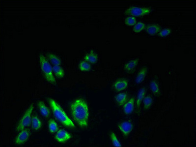 Immunofluorescent analysis of HepG2 cells using CSB-PA892470LA01HU at dilution of 1:100 and Alexa Fluor 488-congugated AffiniPure Goat Anti-Rabbit IgG(H+L)