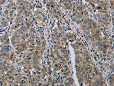 The image on the left is immunohistochemistry of paraffin-embedded Human liver cancer tissue using CSB-PA834141(KISS1R Antibody) at dilution 1/25, on the right is treated with synthetic peptide. (Original magnification: ×200)