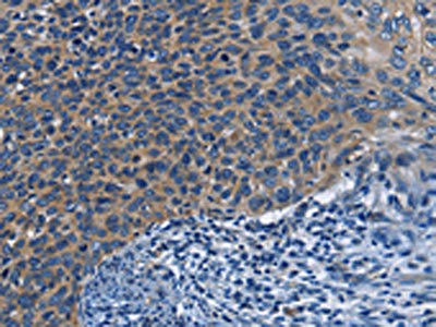 The image on the left is immunohistochemistry of paraffin-embedded Human cervical cancer tissue using CSB-PA249906(KLRB1 Antibody) at dilution 1/40, on the right is treated with fusion protein. (Original magnification: ×200)