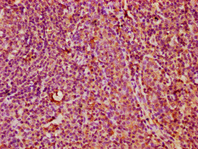 IHC image of CSB-PA23099A0Rb diluted at 1:400 and staining in paraffin-embedded human tonsil tissue performed on a Leica BondTM system. After dewaxing and hydration, antigen retrieval was mediated by high pressure in a citrate buffer (pH 6.0). Section was blocked with 10% normal goat serum 30min at RT. Then primary antibody (1% BSA) was incubated at 4°C overnight. The primary is detected by a biotinylated secondary antibody and visualized using an HRP conjugated SP system.