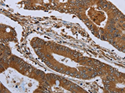 The image on the left is immunohistochemistry of paraffin-embedded Human colon cancer tissue using CSB-PA192826(KLRF1 Antibody) at dilution 1/30, on the right is treated with synthetic peptide. (Original magnification: ×200)