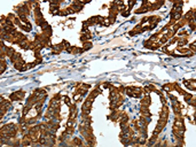 The image on the left is immunohistochemistry of paraffin-embedded Human thyroid cancer tissue using CSB-PA909758(KRT19 Antibody) at dilution 1/15, on the right is treated with fusion protein. (Original magnification: ×200)