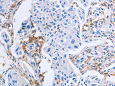 • The image on the left is immunohistochemistry of paraffin-embedded Human lung cancer tissue using CSB-PA694004(LAIR1 Antibody) at dilution 1/25, on the right is treated with fusion protein. (Original magnification: ×200)