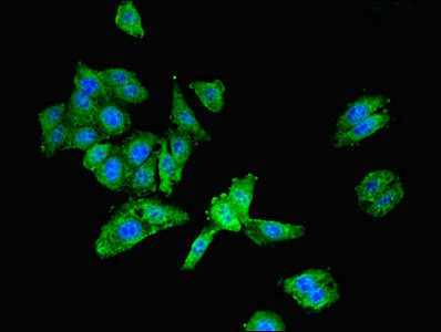 Immunofluorescent analysis of HepG2 cells using CSB-PA012895ESR2HU at dilution of 1:100 and Alexa Fluor 488-congugated AffiniPure Goat Anti-Rabbit IgG(H+L)