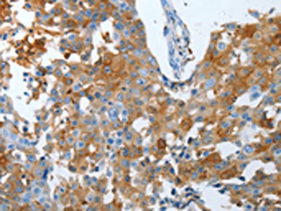 The image on the left is immunohistochemistry of paraffin-embedded Human breast cancer tissue using CSB-PA808676(LOX Antibody) at dilution 1/25, on the right is treated with synthetic peptide. (Original magnification: ×200)