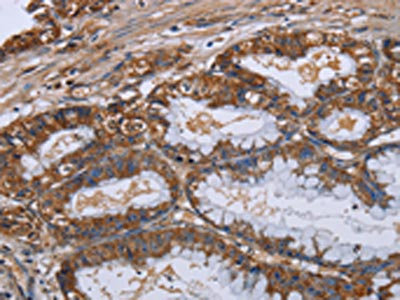 The image on the left is immunohistochemistry of paraffin-embedded Human esophagus cancer tissue using CSB-PA788951(LUM Antibody) at dilution 1/20, on the right is treated with fusion protein. (Original magnification: ×200)