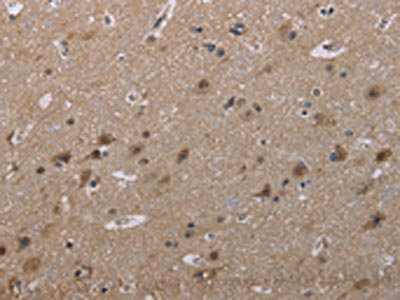 The image on the left is immunohistochemistry of paraffin-embedded Human brain tissue using CSB-PA913398(MAL Antibody) at dilution 1/30, on the right is treated with synthetic peptide. (Original magnification: ×200)