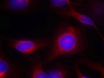 Immunofluorescence staining of methanol-fixed Hela cells using MEK1/MEK2(Ab-217/221) Antibody.