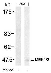 Western blot analysis of extracts from 293 cells using MEK1/MEK2(Ab-217/221) Antibody and the same antibody preincubated with blocking peptide.