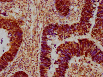 IHC image of CSB-PA013453LA01HU diluted at 1:300 and staining in paraffin-embedded human ovarian cancer performed on a Leica BondTM system. After dewaxing and hydration, antigen retrieval was mediated by high pressure in a citrate buffer (pH 6.0). Section was blocked with 10% normal goat serum 30min at RT. Then primary antibody (1% BSA) was incubated at 4°C overnight. The primary is detected by a biotinylated secondary antibody and visualized using an HRP conjugated SP system.