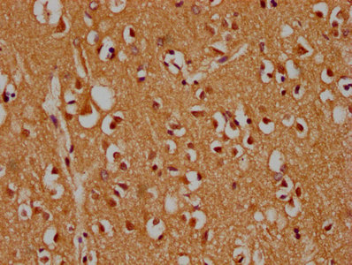 IHC image of CSB-PA013453LA01HU diluted at 1:300 and staining in paraffin-embedded human brain tissue performed on a Leica BondTM system. After dewaxing and hydration, antigen retrieval was mediated by high pressure in a citrate buffer (pH 6.0). Section was blocked with 10% normal goat serum 30min at RT. Then primary antibody (1% BSA) was incubated at 4°C overnight. The primary is detected by a biotinylated secondary antibody and visualized using an HRP conjugated SP system.