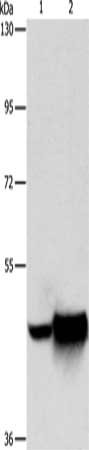 • Gel: 8%SDS-PAGE, Lysate: 60 μg, Lane 1-2: A172 cells, hela cells, Primary antibody: CSB-PA776085(MAPT Antibody) at dilution 1/150, Secondary antibody: Goat anti rabbit IgG at 1/8000 dilution, Exposure time: 40 seconds