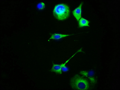 Immunofluorescence staining of MCF-7 cells with CSB-PA013562LA01HU at 1:100, counter-stained with DAPI. The cells were fixed in 4% formaldehyde, permeabilized using 0.2% Triton X-100 and blocked in 10% normal Goat Serum. The cells were then incubated with the antibody overnight at 4°C. The secondary antibody was Alexa Fluor 488-congugated AffiniPure Goat Anti-Rabbit IgG(H+L).